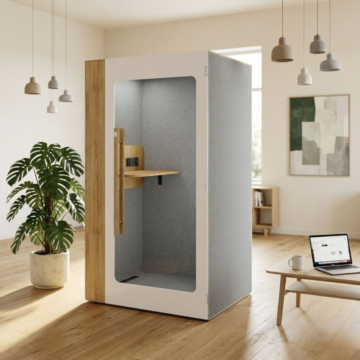 Minimalna ingerencja w biuro – budka nie wymaga przebudowy ścian ani dodatkowych pomieszczeń, a wymiary 220 × 106 × 123 cm ułatwiają ustawienie jej w korytarzu lub w rogu open space.