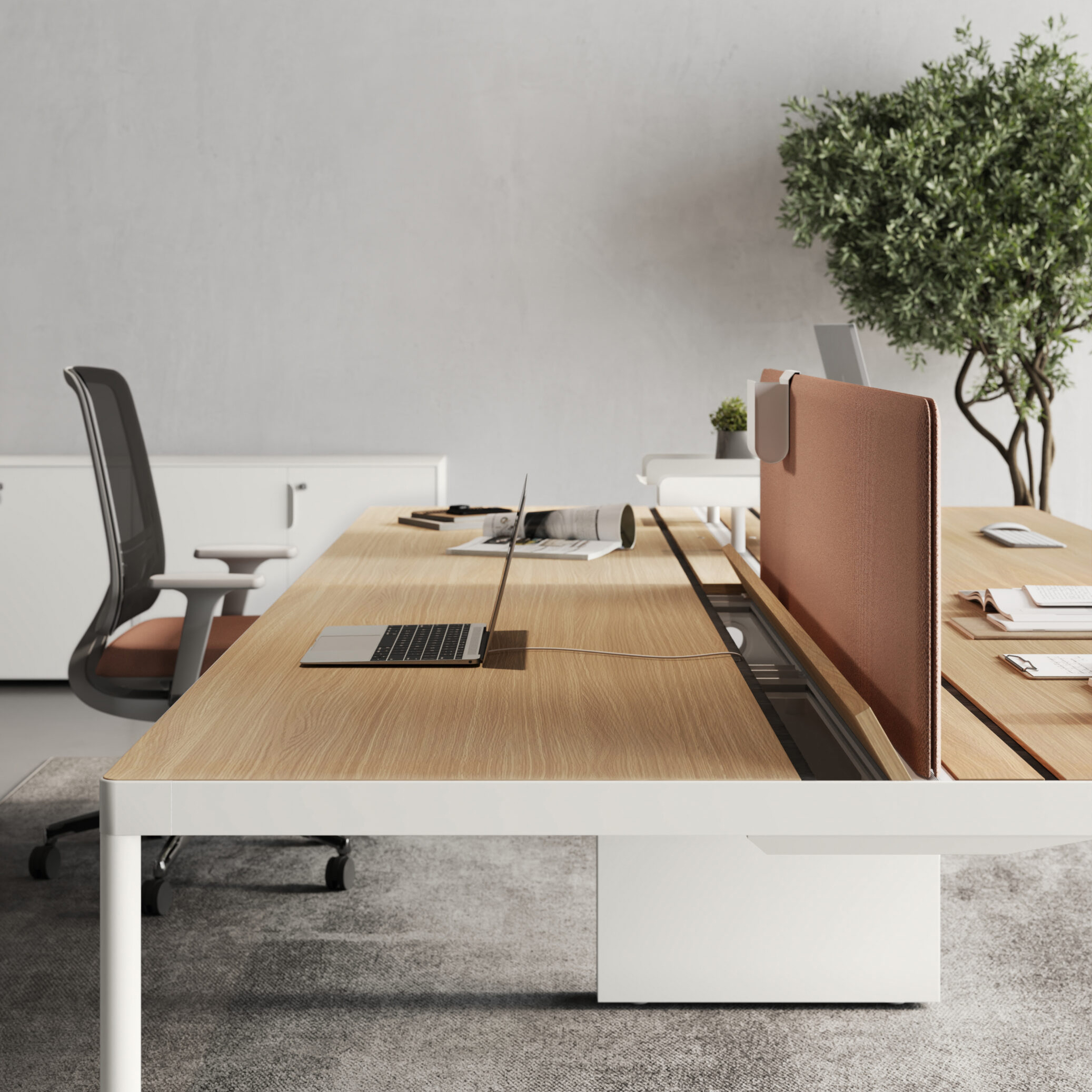 Biurko workbench w standardzie nie zawiera widocznego na zdjęciu panelu akustycznego jest to opcja dodatkowo płatna.