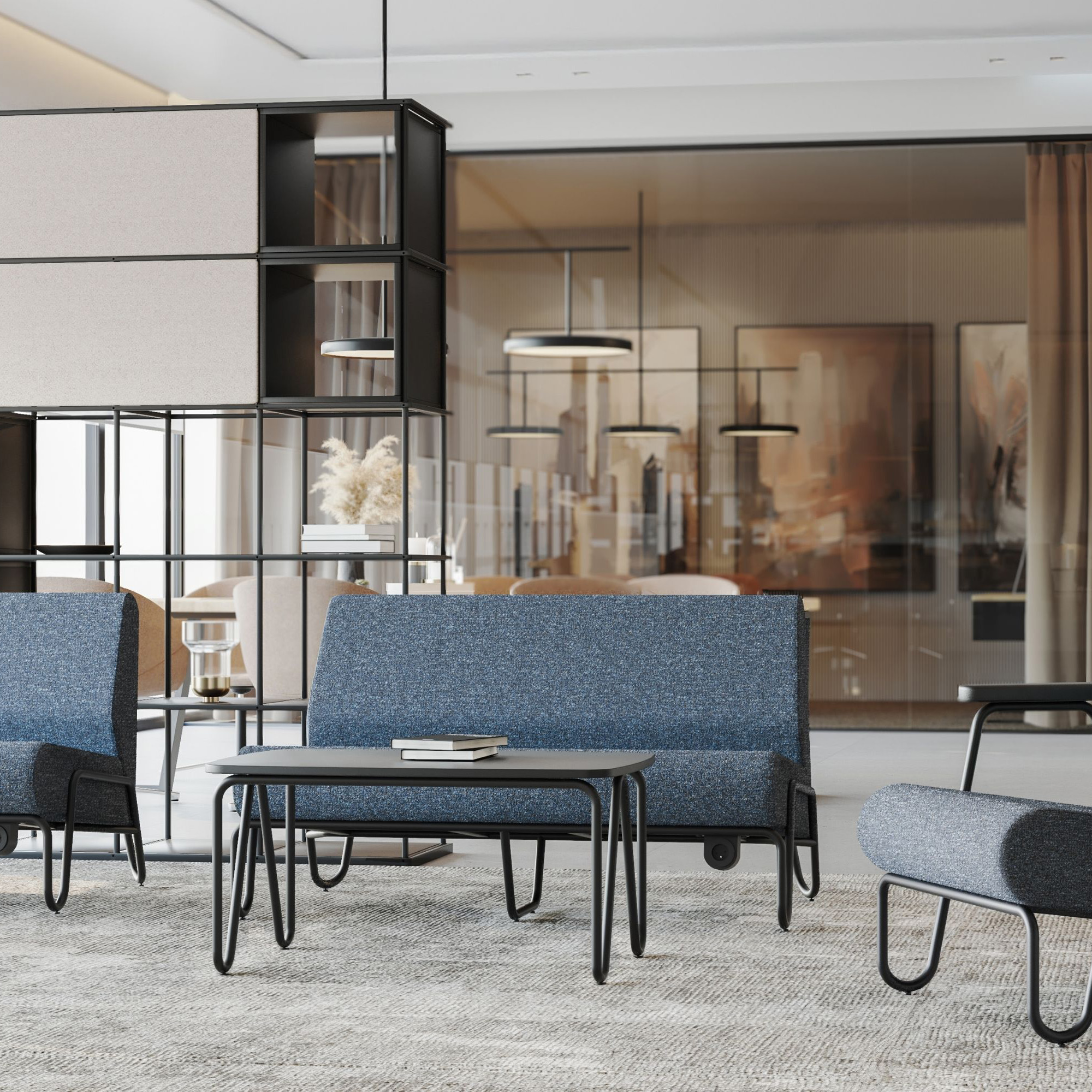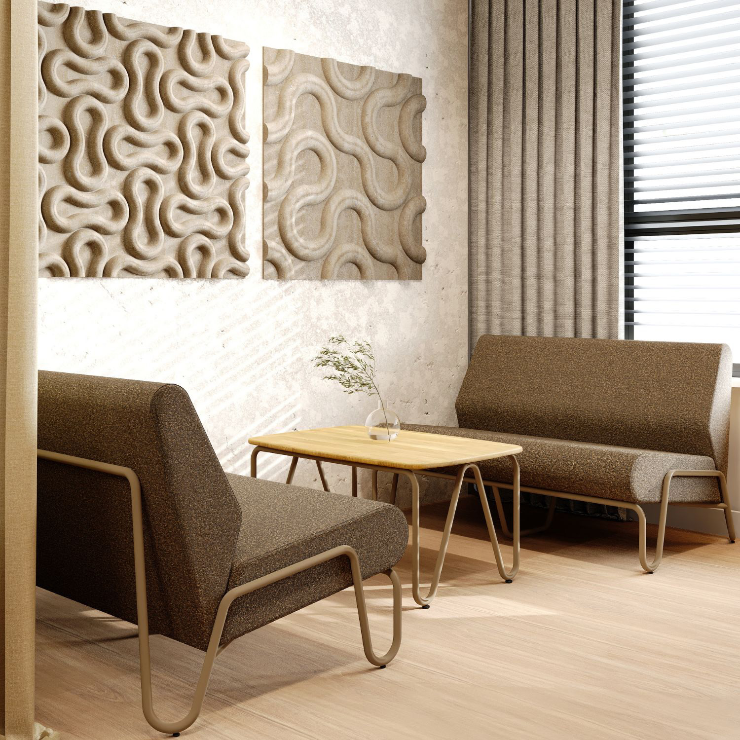 Siedzisko i oparcie zostały sklejone z miękkiej, dobrze wyprofilowanej tapicerki, zapewniając przytulną, swobodną siedzibę wręcz stworzoną do relaksu. Minimalistyczny design, kontrastujące proporcje oraz delikatna geometria metalowego rusztu sprawiają, że fotele doskonale wpisują się zarówno w nowoczesne wnętrza, jak i przestrzenie publiczne o retro charakterze.
